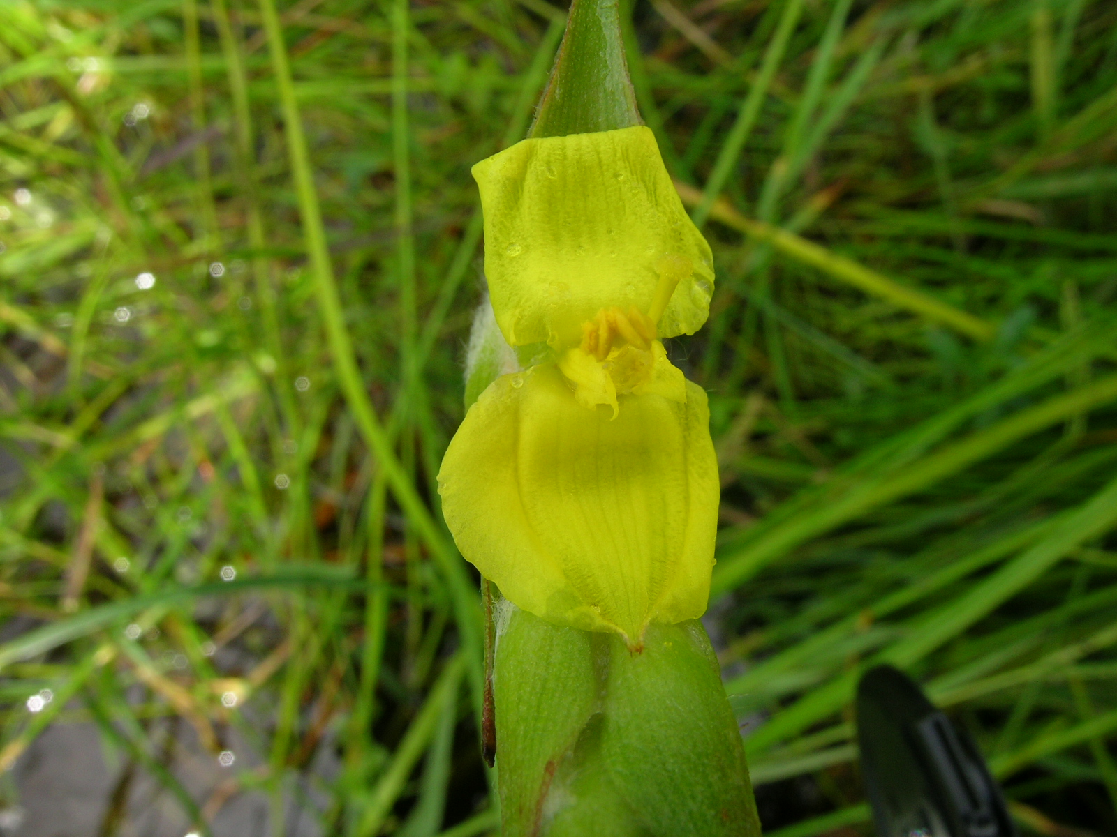 Herbs tufted. Basal leaves 12--25, 30--80 cm including sheath 1--1.5 cm × 2--3.5 mm; leaf blade soft, veins 7--9, apex tapering. Cauline leaves usually 2 or 3. Flowering stem scapose, slender, terete, glabrescent proximally, villous toward inflorescence. Spikes simple, sometimes branched, woolly; bracts ovate, 2--7 × 0.7--1 cm, abaxially woolly, apex abruptly acuminate and subulate. Outer 2 perianth segments subovate, 8--10 mm, abaxially woolly, base with 2 strong veins, margin undulate, apex acute; inner 2 segments smaller than outer 2, spatulate, membranous, veins 3, base adnate to filament for 1--2 mm, apex acute. Stamen 6--9 mm, glabrous; filament flattened; anther subglobose. Ovary 6--7 mm, densely long woolly. Style 3--4 mm, glabrous; stigma dark reddish, capitate, 0.7--0.9 mm, long papillose.